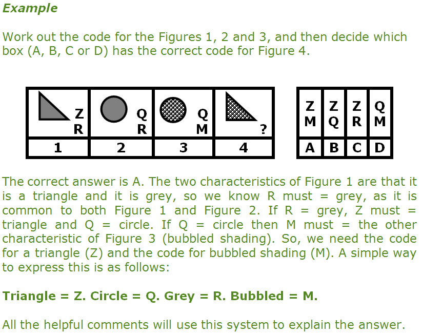 The figures in the boxes on the left hand side of the page have been given letter codes that describe certain aspects of their appearance. Using this information you can find the code for the shape in the box on the right. There is a detailed explanation of how they work in the example question and answer, so just work out the codes of two figures which have something in common first, and then the rest will fall into place.